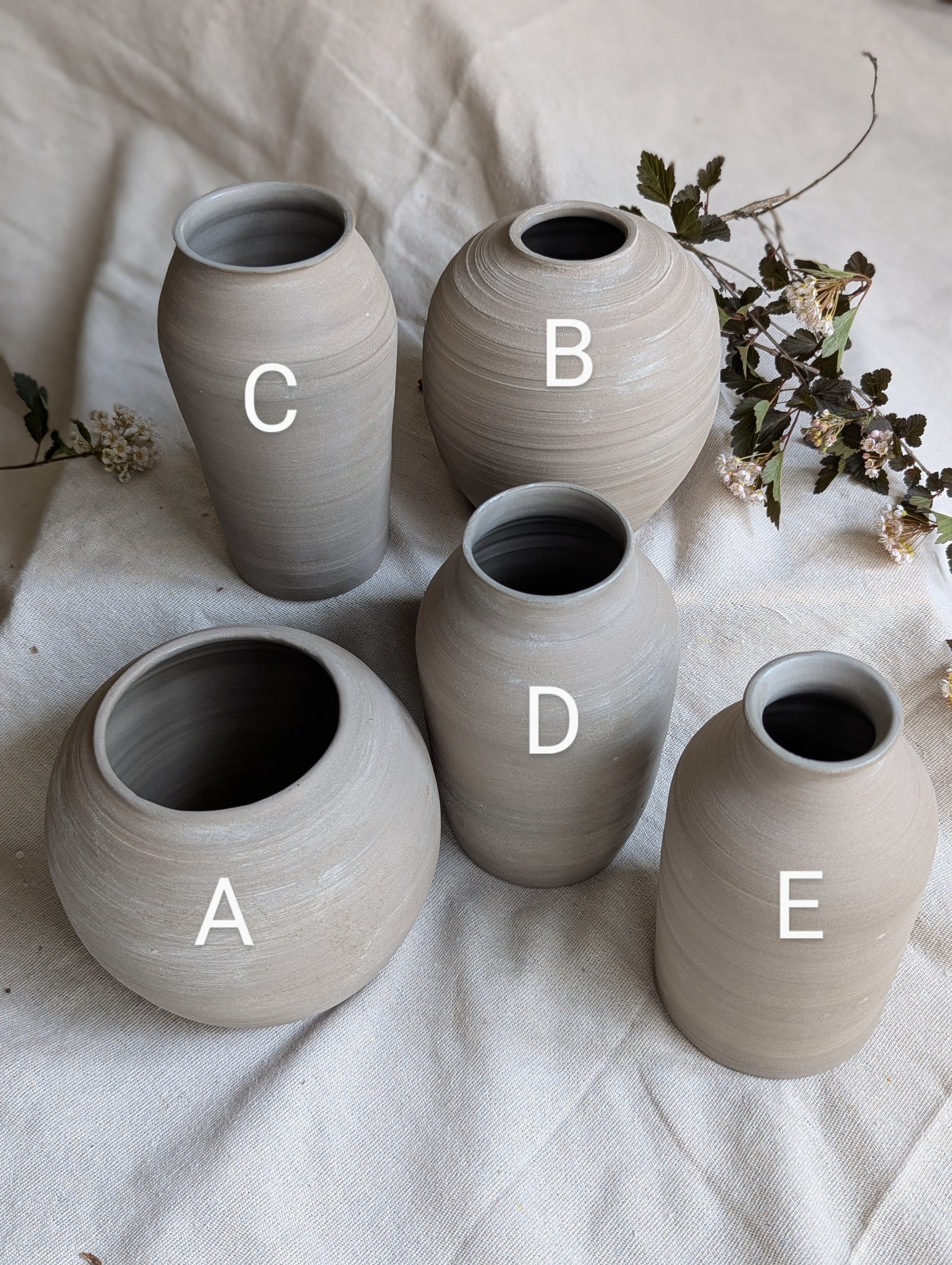 Made with grey stoneware clay these vases feature the natural beauty of the clay with which they were made.